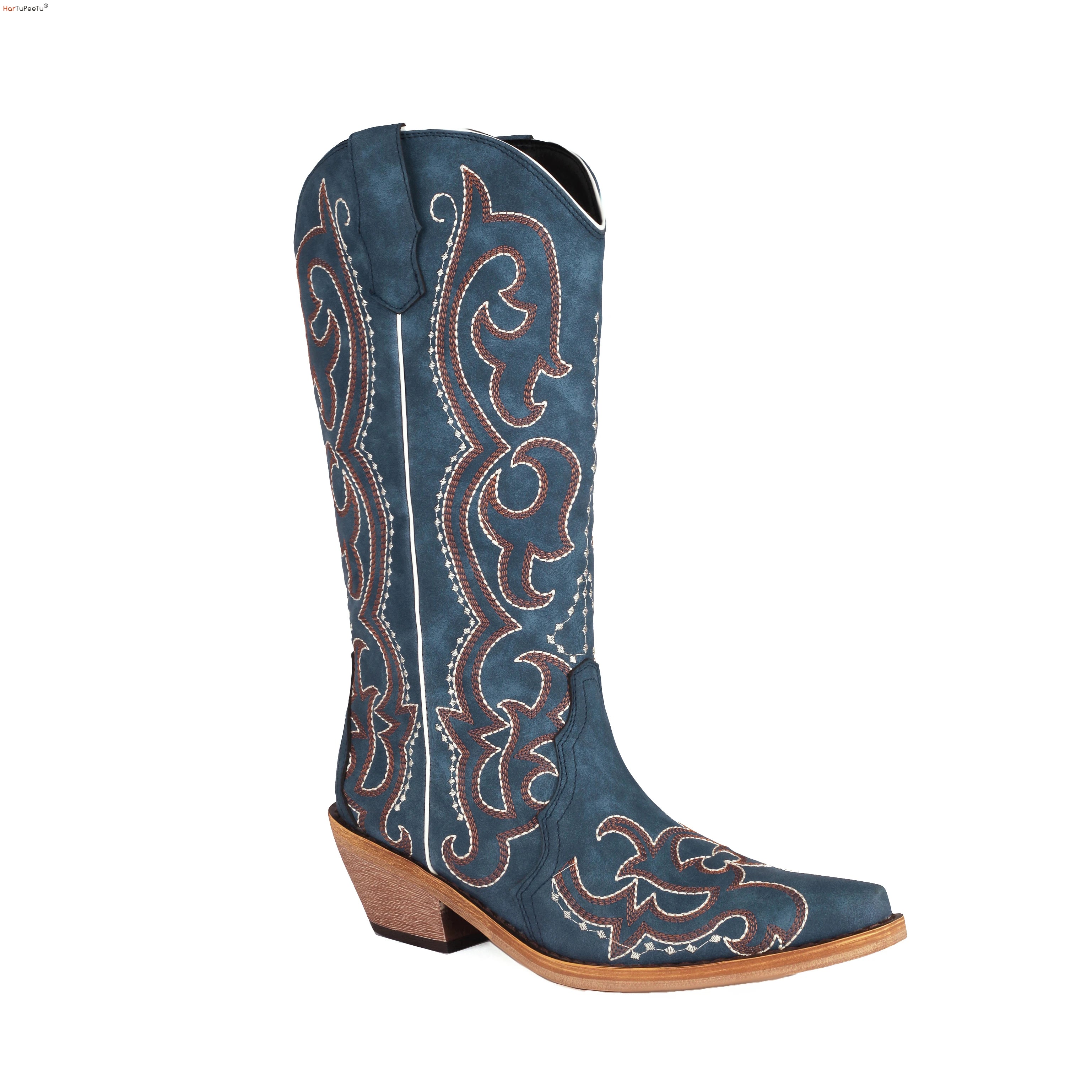 Women’s Blue Western Cowboy Boots Comfortable Wide Calf with Embroidery
